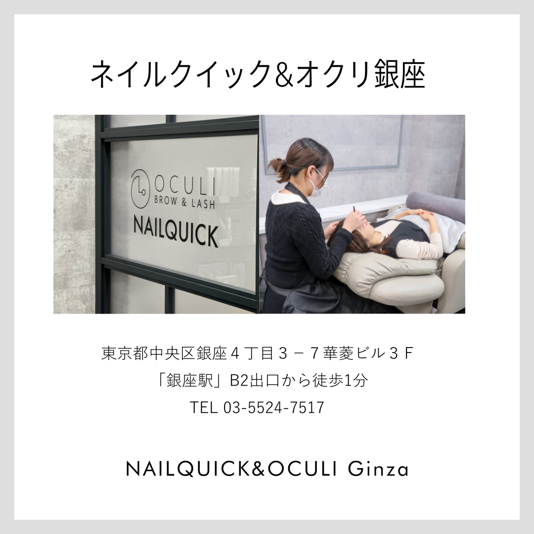 - Ginza / Omotesando - 骨格や希望に合わせた アイブロウ・育毛アイラッシュを プロがご提案 忙しいあなたへ アイブロウまたはアイラッシュと同時に、フットネイルの施術が可能です。 ご予約はお電話にて承っております。 銀座店のWEB予約はこちら 表参道店のWEB予約はこちら ネット予約する ネイルクイックの品質QUALITY ネイルクイック最大の特徴は高品質なサービスを提供することです。 デザインやスタッフの技術はもちろん、お客様が安心してくつろげる空間をご用意してお待ちしております。 高い品質と上質なサービス 化粧品成分100%純国産ジェル 優秀な講師陣が指導ハイレベルな技術力 ライフスタイルに応じたメニュー選び ネイルクイックの品質 ネイルスクール オリジナル商品 ネイルサロン検索 採用情報 TOP キャンペーン オクリ OCULI BROW & LASH