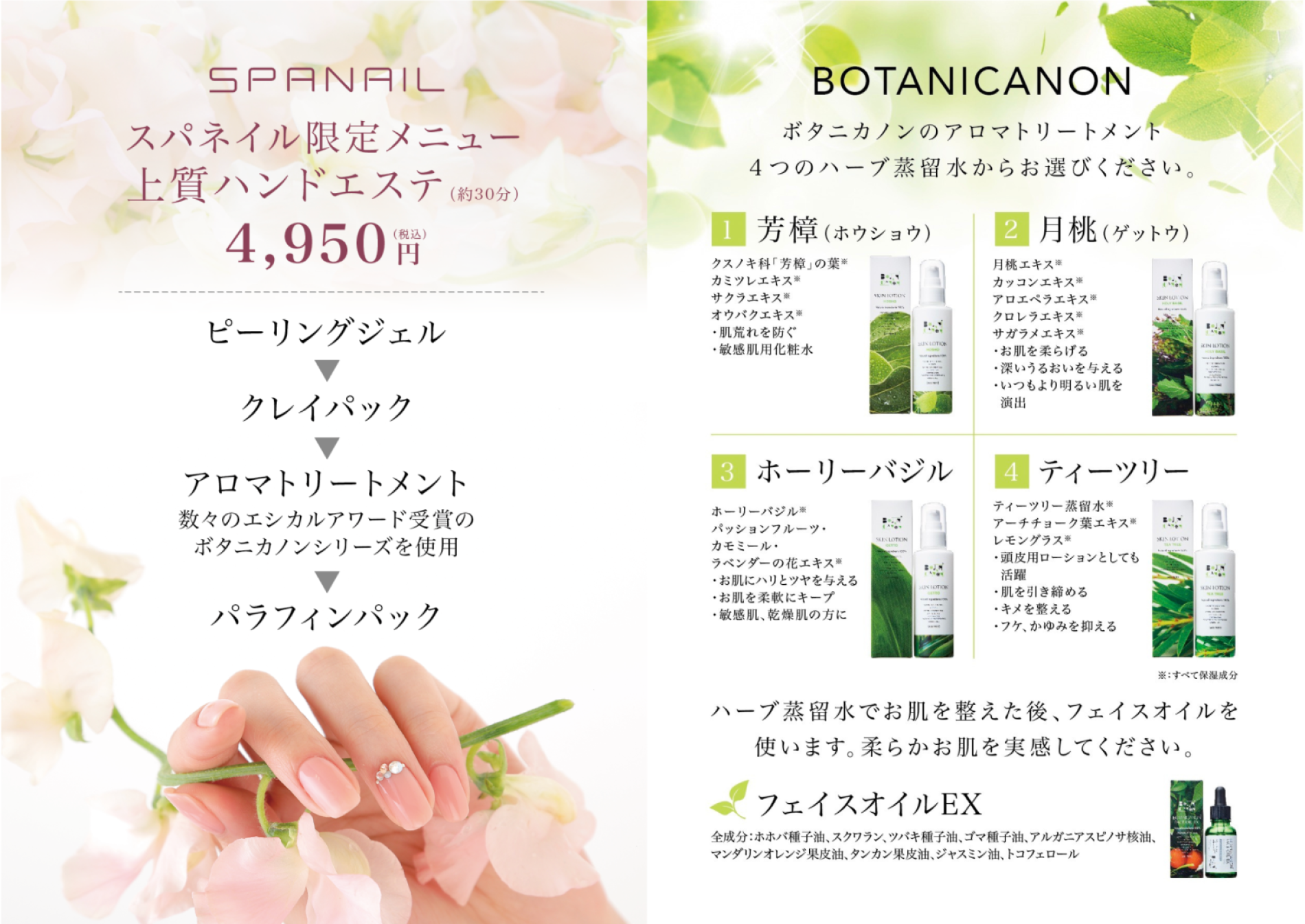 ピーリングジェル、クレイパック、アロマトリートメント(数々のエシカルアワード受賞のボタニカノンシリーズを使用)、パラフィンパック