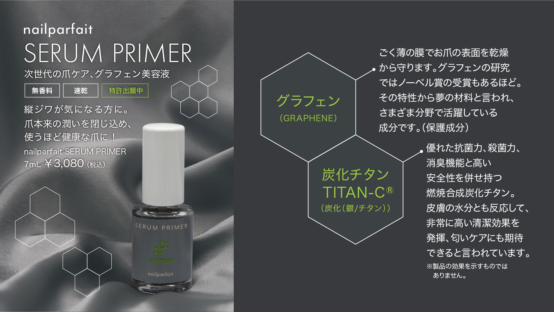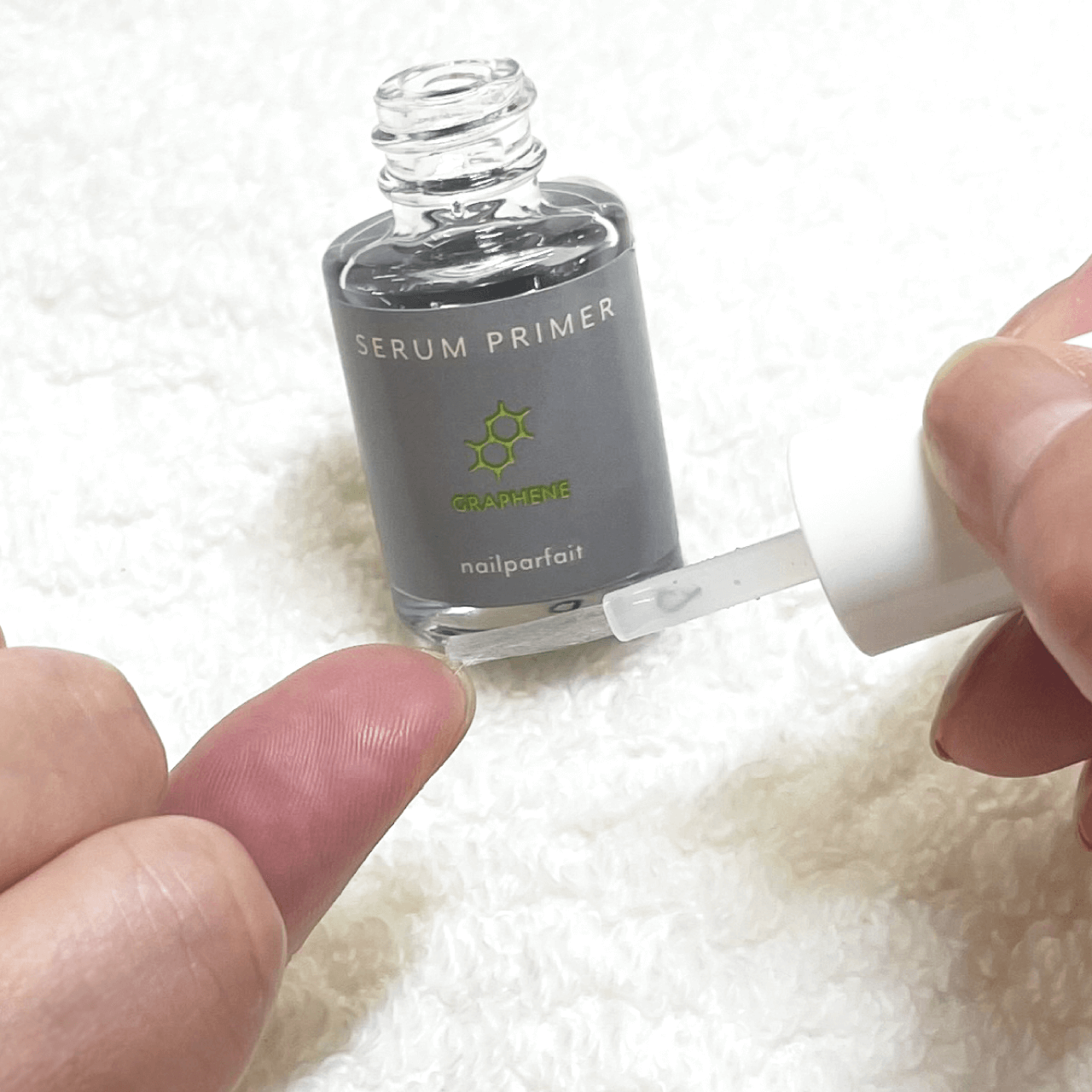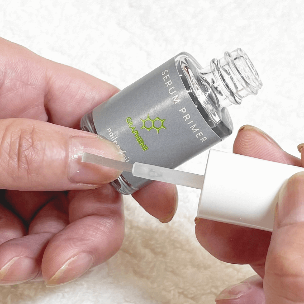 ・最初にセラムプライマーを爪の表面と裏側に直接塗布します。炭化チタン※1 とグラフェン※2 のうすい膜で爪を保護します。
