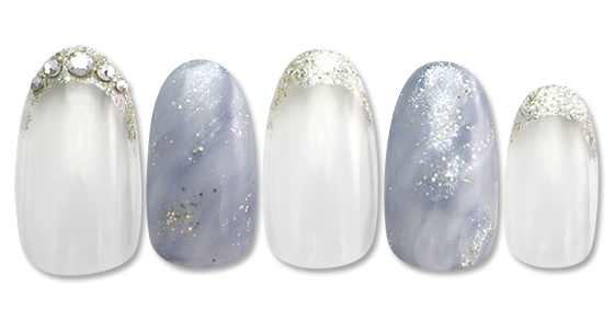 シルバーの光沢とクリアベースが美しい冬のフレンチデザイン。