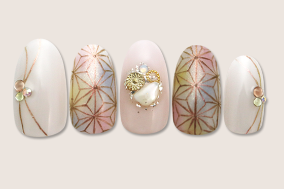 やわらかな色味に繊細な麻の葉模様を重ねた、上品フェミニンな和柄ネイル。