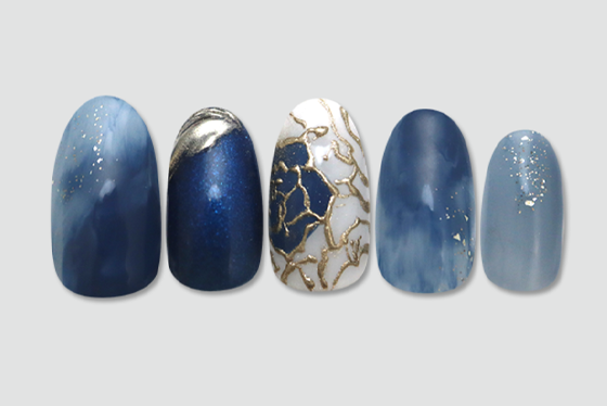 奥行きのある藍のニュアンスに、ゴールドのラインが引き立つ和モダンネイル。